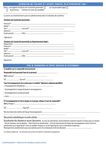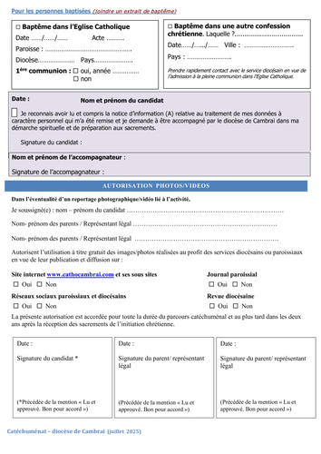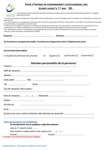 Cette nouvelle fiche d'entrée en cheminement concerne tous les sacrements de l'initiation chrétienne à savoir : le baptême, la confirmation et l'eucharistie ET AUSSI pour la demande d'un seul sacrement pour les adolescents.