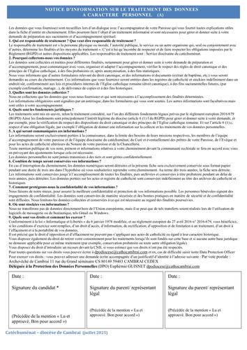 la "NOTICE D’INFORMATION SUR LE TRAITEMENT DES DONNEES A CARACTERE PERSONNEL (A)" est à photocopier et à laisser aux parents afin qu'ils puissent concerver l'adresse du responsable diocésain en cas de réclamation sur les données personnelles.